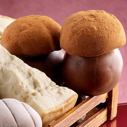 | CIOCCOLATO BIANCO 1000 gr. PASTA ALLE MANDORLE TOSTATA 200 gr. RISO SOFFIATO 100 gr. | Mescolare i vari ingredienti, temperarli a 25°C, colare nello stampo "Fungo Porcino", raffreddare in frigorifero, togliere dallo stampo, spruzzare con una soluzione temperata di cioccolato e burro di cacao 50/50, raffreddare in frigorifero e passare la testa del "porcino" nella polvere di cacao. |