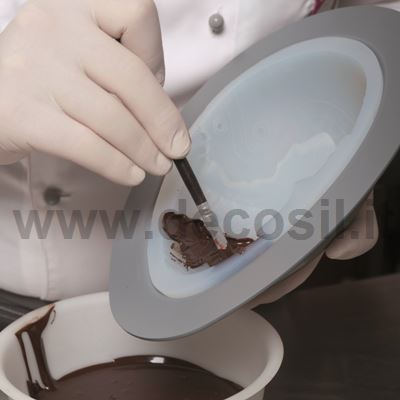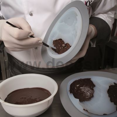 Utilice un pincel ó una manga, con chocolate temperado, para pintar ó rellenar las figuras y así conseguir una primera capa de chocolate.
